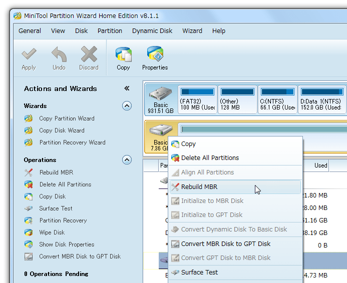 その後、ディスクを右クリック → 「Rebuild MBR」を実行 する。