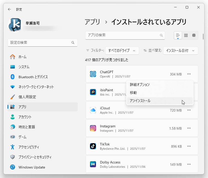 (「アプリ」>「インストールされているアプリ」)