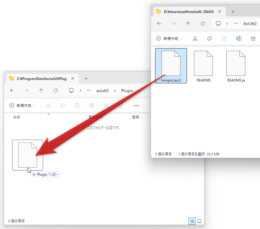 C:\ProgramData\aviutl2\Pluginフォルダ内にコピーします。 拡張プラグイン(「x264guiEx」など)をポータブルインストールした場合は、「lwinput.aui2」を「aviutl2.exe」と同じフォルダ内に作成した「data」フォルダ内の「Plugin」フォルダ内にコピーします。