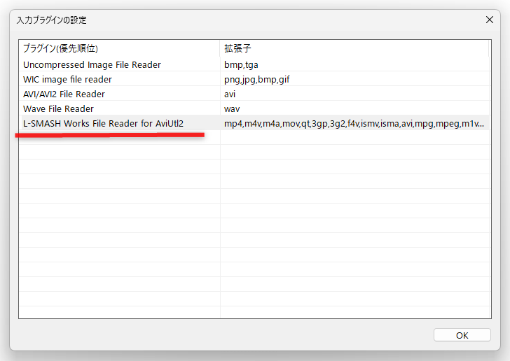 - 「L-SMASH Works File Reader for AviUtl2」というプラグイン名が表示されていれば操作は完了です。
