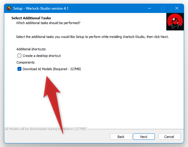 - インストールの途中で表示される「Select Additional Tasks」という画面では、「Download AI Models (Required - 327 MB)」にチェックを入れておきます。