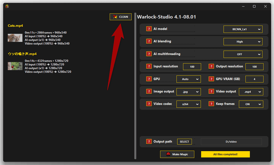 続けて他の動画や画像を処理する場合は、画面上部にある「CLEAN」ボタンをクリックし、登録したファイルをクリアしてから別のファイルを選択 → パラメータを設定した後に「Make Magic」ボタンをクリックします。