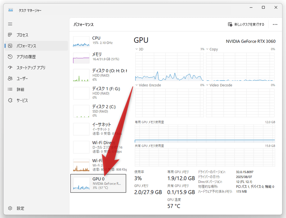 GPU の番号は、タスクマネージャーの「パフォーマンス」画面で確認することができます。