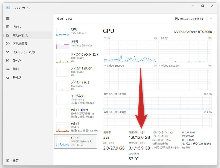 使用している GPU の VRAM サイズは、やはりタスクマネージャーの「パフォーマンス」画面で確認することができます。