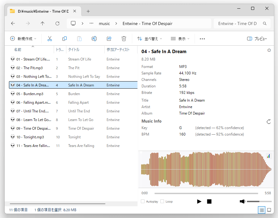 エクスプローラーに、選択している音声ファイルの再生 / タグ表示 / 波形表示 機能を追加するソフト。