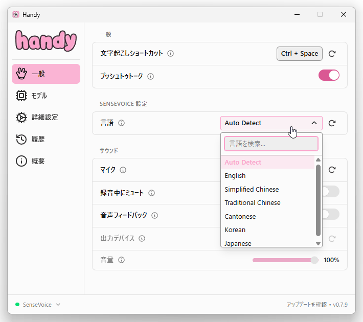 「Parakeet V3」がオススメとして表示されていますが、「Parakeet V3」は日本語音声の認識に対応していないため、日本語の文字起こしをする際は「SenseVoice」や「Whisper」モデルの方が良いでしょう。