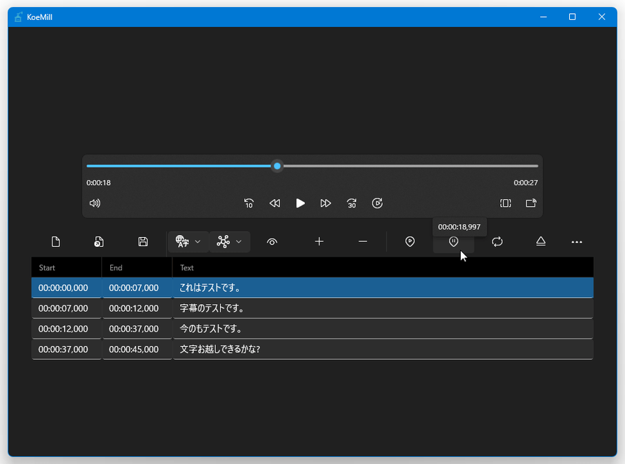 尚、文字起こし結果のテキストは、SRT 形式の字幕ファイル、もしくは TXT / CSV ファイルとして書き出すことができ、保存した SRT ファイルは「KoeMill」で読み込んで再編集することもできたりします。