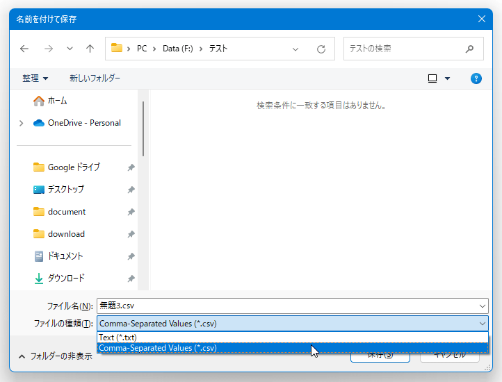 ちなみに、CSV ファイルとして出力する時は、ファイルの種類を「Comma-Separated Values (*.csv)」に変えてから保存を行います。