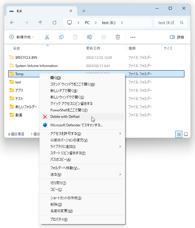 あとは、削除したいファイルやフォルダを右クリック →「その他のオプションを確認」を選択 →「Delete with DelFast」を選択すれば OK です。