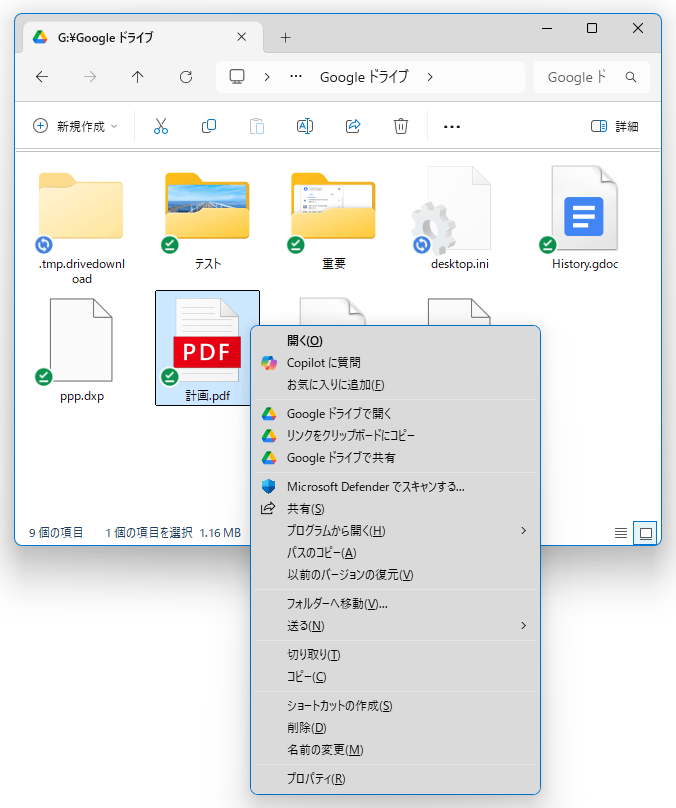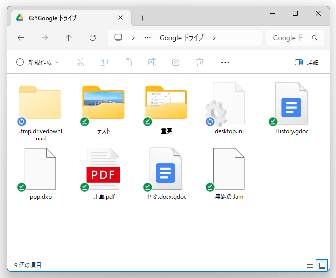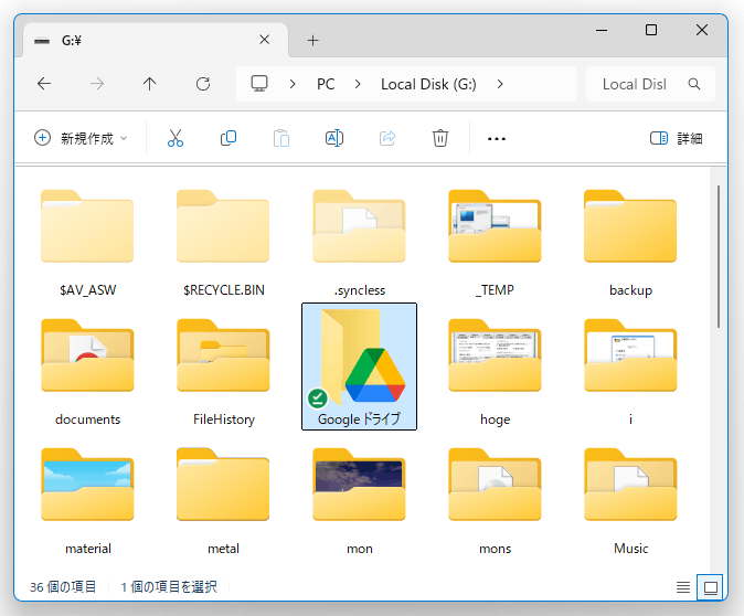 - エクスプローラで、Google ドライブのマウント先が表示されます。